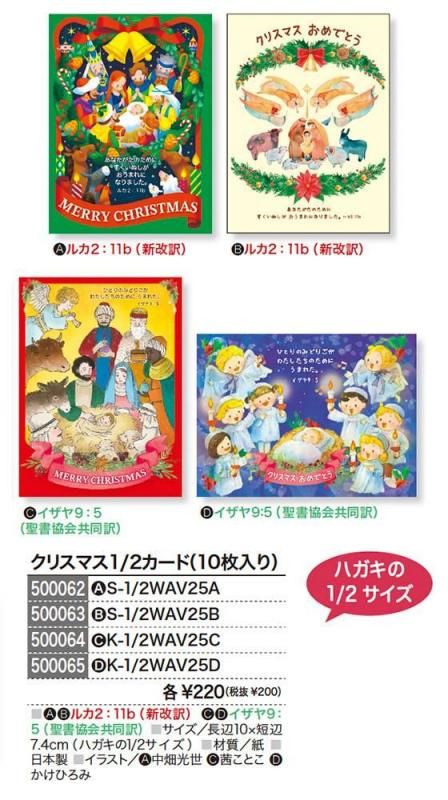 クリスマス1/2カード(10枚入り) メーカー:いのちのことば社 ■材質/紙 ■日本製 ■サイズ/ハガキの1/2サイズ --------------------------------------------- A)500062 ■ルカ2:11b(新改訳) ■イラスト/中畑光世 --------------------------------------------- B)500063 ■ルカ2:11b(新改訳) --------------------------------------------- C)500064 ■イザヤ9:5(聖書協会共同訳) ■イラスト/茜ことこ --------------------------------------------- D)500065 ■イザヤ9:5(聖書協会共同訳) ■イラスト/かけひろみ 【お取寄せ】クリスマス1/2カード(10枚入り) ※選択(500062・500063・500064・500065) 型番 CR2025-1/2 ポイント 11pt 販売価格 220円 購入数 A-500062220円B-500063220円C-500064220円D-500065220円 オプションの価格詳細はコチラ shopping_cartカートに入れる mail_outline この商品についてお問い合わせ ツイート error_outline 特定商取引法に基づく表記 (返品など) share この商品を友達に教える undo 買い物を続ける forum レビューを見る(0件) rate_review レビューを投稿