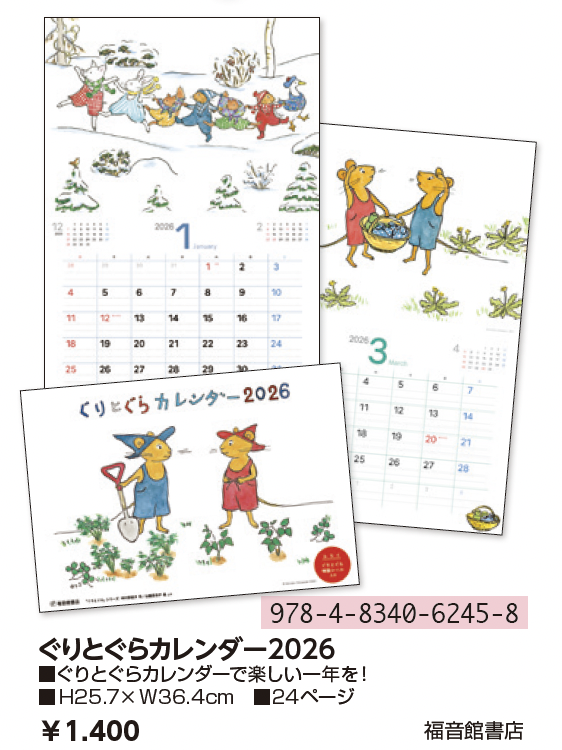 ■いつも元気な「ぐりとぐら」と一緒に、1年を過ごしませんか?予定をたくさん書き込め、シンプルで見やすい、毎年人気のカレンダー。すがすがしく楽しい気分を味わえます! ■ H25.7×36.4cm ■24頁 ■上開き 【メーカー取寄せ☆予約】2026 ぐりとぐらカレンダー 型番 9784834062458 ポイント 70pt 販売価格 1,400円 購入数 shopping_cartカートに入れる mail_outline この商品についてお問い合わせ ツイート error_outline 特定商取引法に基づく表記 (返品など) share この商品を友達に教える undo 買い物を続ける forum レビューを見る(0件) rate_review レビューを投稿